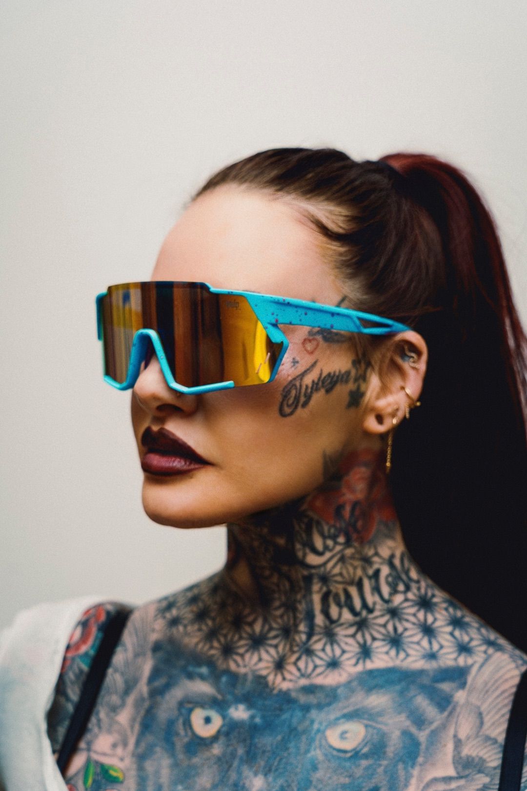 Embrace high-octane energy with these electric blue performance sunglasses, designed for a bold, athletic-inspired look. The vibrant cyan frame features a rugged, geometric design with a unique paint-splatter texture, paired with an oversized gold-mirrored shield lens that provides a sharp visual contrast. Engineered with an aggressive, wrap-around silhouette and ventilated temples, these glasses merge Y2K retro-sport aesthetics with modern streetwear edge, making them a standout accessory for any high-intensity lifestyle.